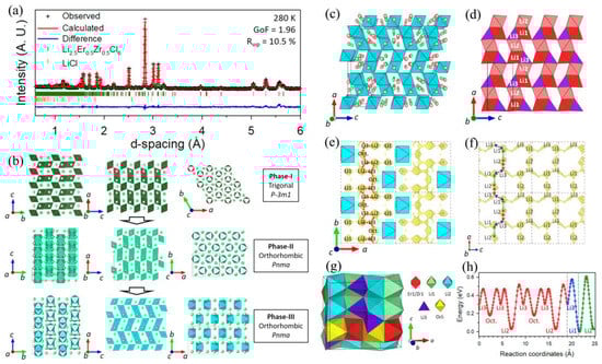 Bond-valence site energy (BVSE) methods [,] can calculate the energy landscape of the Li+ diffusion pathway. In Figure 1e, the [Li3–Oct.–Li3–Li2] zigzag chain running along the [010] direction was the most desired one-dimensional pathway. This pathway along the b-axis intersects with [Li2–Li3–Li1] chains of the ac-plane (Figure 1f) to form a 3D network for Li+ migration. In Figure 1g, a metastable octahedral interstitial site, namely “Oct”, which is face-shared with Er/Zr octahedra, was suggested to participate in the Li+ migration. Moreover, the site energy profile (Figure 1h) extracted from the overall landscape reveals a lower energy barrier for orthorhombic Li2.5Er0.5Zr0.5Cl6 (phase III). The barrier for trigonal Li3ErCl6 (phase I) was claimed be about 1.5-fold higher than this orthorhombic one.
