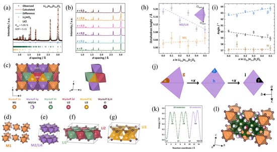 Through NPD refinements (Figure 8c), they found that Li+ ions in as-milled α-LZC prefer to occupy 6h sites (Figure 8d), but in contrast, in Li3YCl6 two Li sites (6g and 6h) are both well-occupied (occupancy > 0.50) []. The BVSE method [,] calculates the migration pathway and energy barrier (Figure 8e–l). For α-LZC, the most energetically favorable diffusion pathway is the [Li1–Li2–Li1] chain along the c-direction, as marked in red in Figure 8f–h. Beside this diffusion chain, Li+ is also likely to diffuse along the [Li1–i1–Li1–i2–Li1] pathway (i represents the interstitial site), or [Li2–i3–Li2] pathway, as marked in blue and green, respectively, in Figure 8f–h. These two alternative pathways could link the above [Li1–Li2–Li1] chains to establish a 3D diffusion network, of which the migration barrier is 0.803 eV (Figure 8g,h). For the β-LZC structure (Figure 8i), the relatively favorable Li+ pathways reside within the layers in the ab-plane, as marked in red in Figure 8j–l, with a similar barrier of 0.809 eV (Figure 8l). However, the barrier of migration between adjacent layers is significantly higher (2.987 eV), as marked in blue in Figure 8k,l.