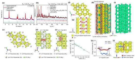 Joint refinements on (a) synchrotron diffraction data (wavelength 0.687 Å) and (b) TOF NPD data. (c) Refined structure of Li0.388Ta0.238La0.475Cl3 viewed along c-axis. (d) Coordination conditions of Li1. The red polyhedrons stand for [LiCl6] polyhedron. (e) Coordination environment of Li2 site. The [LiCl5] polyhedron is marked in red. It should be emphasized that the ions’ positions only reflect the averaged probability of residence, not real existence of ions. (f) View along c-direction of the LaCl3 lattice. The inner diameter of the channel is around 4.6 A. (g) Side view of the vacancy-contained LaCl3 lattice. The Li+ ions could migrate along the 1D channel (red spheres) and cross the channel (bidirectional red arrows) via vacant octahedra (grey). (h) AIMD-simulated green isosurfaces representing Li+ probability density (at 900 K) (i) Isolated Li+ probability density isosurfaces in which all [LaCl9] polyhedrons are omitted to give a clear view of the interconnectivity of the diffusion pathways. (j) AIMD-simulated Arrhenius plot of Li+ diffusion at selected temperature points. (k,l) Li+ migration pathways and energy barriers. The migration along the 1D channel in the c-direction is shown in red as path 1, and the migration across the adjacent channels are shown in blue as path 2. Reproduced with permission: Copyright 2023, Springer Nature [].
