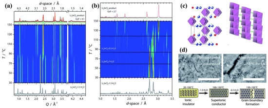 Bearing this in mind, the first work discussed here is about the in situ NPD/XRD study of the dehydration process of Li3InCl6 (that is from Li3InCl6·1.5H2O to pure Li3InCl6) conducted by Sacci et al. []. They emphasize that careful consideration should be taken during the dehydration process and a strong vacuum is indispensable. In situ NPD revealed that the dehydration process actually involves multiple phase transitions that could significantly vary the conductivity. The lithium conductivity can be related to the amount of residual H2O, the structural stability and ordering of the lithium sublattice.