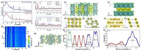 (a) XRD data collected for as-milled α-LZC and 350 °C-annealed β-LZC. (b) In situ NPD profile of the dependence on temperature from 27 to 427 °C for the as-milled LZC. (c) NPD Rietveld refinements for the as-milled β-LZC at 427 °C and α-LZC at 27 °C. (d) The structural model of α-LZC obtained from the NPD Rietveld refinement. The brown, bluish-grey, light-green balls represent Li, Zr, Cl atoms, respectively. (e) The crystal structures of α-LZC covered with Li+ potential map. (f,g) Possible Li+ migration pathways of α-LZC viewed along b and c-directions. (h) Extracted energy profiles corresponding to different migration pathways in α-LZC. (i) The crystal structures of β-LZC with superimposed Li ion potential map. (j,k) Possible Li+ migration pathways of β-LZC viewed along c and b-directions. (l) Extracted energy profiles corresponding to different migration pathways in β-LZC. Noted that each energy profile corresponds to the pathway of the same color in (h,l), respectively. Reproduced with permission: Copyright 2021, Springer Nature [].