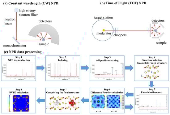 Similar to XRD, NPD also follows the Bragg diffraction law and diffraction geometry. As shown in Scheme 1a,b, NPD can be performed using a constant wavelength (CW) neutron beam or time-of-flight (TOF) neutron beam. The NPD data can be proceeded by Jana [], Fullprof [], etc. Conventionally, as shown in Scheme 1c, NPD data-processing includes the following steps: (1) Data collection. Instrument scientists will help users to load a powder sample in the sample holder on the diffractometer. A neutron beam will penetrate the sample and trigger diffraction. Multiple detectors at different angles will simultaneously collect diffraction peaks. After data correction, the original NPD data is returned to the users. (2) Indexing. If the crystal structure is already known, then this step can be skipped. However, if the structure is new (unknown, unreported), then this step is unavoidable. One needs to identify most diffraction peaks and then run an “indexing” function to find out the lattice type, lattice parameters, and space group. Note that indexing can be pre-run in the XRD pattern. The indexed lattice must be in agreement with TEM diffraction. (3) hkl Profile matching. This is also a refinement procedure. Before solving the atomic positions, one needs firstly to refine the peak shape, peak asymmetry (if it has any), zero shift, background and lattice parameters, with correct instrument parameters. Each peak and the background line should be well-simulated, usually with a total evaluating factor χ2 < 2. Since the program will later extract these simulated peak intensities of hkl indices for structure solution and structure refinements, this profile-matching step must be well-done. (4) Structure solution. If the structure model is already known, then this step is skipped. If it is new, then one must run a “solve” function. The program will try to solve the phases of structure factors and finally return a rough structure model via an inversed Fourier transform. This rough model is usually incomplete, and may have some flaws or mistakes in atom positions. (5) Rietveld refinements with structure model. By the least-square method, parameters like atom positions, occupancies and thermal displacements will be refined. As the simulated intensities (of the structure model) gradually approach the observed ones, the structure model is getting more and more close to the true crystal structure. (6) Difference Fourier calculation. This is to check the residue nuclei densities in the structure and to identify if they represent missing atoms. One needs to complement the missing atoms in the structure model and go back to step (5) to refine again, until all of the atoms are found out. (7) Completing the structure. After locating all the atoms, final rounds of refinements are needed to complete the whole structure. The structure and all parameters should be chemically reasonable, and evaluating factors should be within an acceptable range, empirically, χ2 < 2, Rwp < 13%. (8) Bond-valence site energy (BVSE) calculation [,]. On the basis of this refined structure and hkl intensities, the BVSE will calculate the overall landscape of Li+ site energy and point out possible Li+ diffusion pathways in the structure.