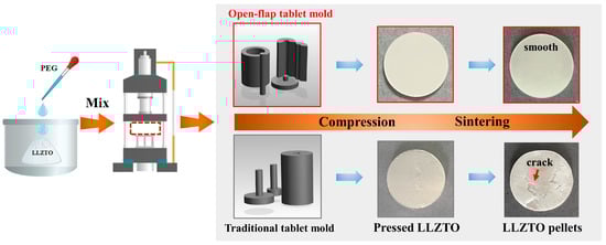 The synthetic route of LLZTO is illustrated in Figure 1. To fabricate LLZTO pellets, a mixture of LLZTO powder and PEG was compressed into circular plates using a specifically designed open-flap tablet pressing mold. The resulting plates had a diameter of 12 mm. Using traditional cold pressing molds can lead to an uneven stress distribution, causing edge cracking or fracturing during demolding. Cracks may be present on the green compacts formed by cold pressing, and these cracks do not heal during sintering, resulting in cracks in the final sintered products [37,38,39]. These internal cracks in the solid-state electrolyte significantly affect ion transport and electron transport while also adversely impacting the mechanical strength of the solid-state electrolyte. To address these issues, we developed an open-flap tablet mold to avoid structural damage during demolding. The use of this self-developed open-flap tablet mold preserves the integrity of the circular compacts and, after sintering, the compacts exhibit a smooth surface with good surface morphology. This approach helps eliminate the appearance of cracks and ensures better mechanical strength in the solid-state electrolyte. The smooth surface morphology and absence of cracks after sintering are crucial factors in enhancing the overall functionality and stability of the final solid-state electrolyte pellets.