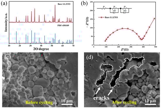Characterization of the as-prepared LLZTO garnet electrolyte pellet. (a) XRD comparison of LLZTO. (b) EIS spectra of the LLZTO electrolyte at a temperature of 25 °C. (c) Cross-section SEM image of LLZTO pellets. (d) Cross−section SEM image of LLZTO after 50 cycles.