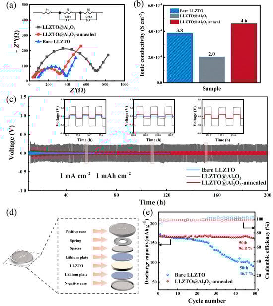 (a,b) The impedance distribution and ion conductivity maps of three types of samples, bare, coated, and annealed after coating, are presented in this figure. (c) Constant current cycle curves of Li/LLZTO/Li, Li/LLZTO@Al2O3/Li, and Li/LLZTO@Al2O3−anealed/Li symmetrical batteries at a current density of 1 mA cm−2 are presented in this figure. (d) The schematic diagram of the Li/LLZTO/Li symmetric battery assembly. (e) Long cycle curves of the entire battery assembled with bare and annealed samples and an NMC811 positive electrode.