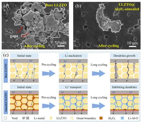 The LLZTO with a uniform GB modification layer exhibited excellent cycling performance, and our research endeavored to unravel the underlying mechanisms behind the functioning of the modifying layer in this context. As shown in Figure 5a, after 50 cycles, the bare sample exhibited numerous gaps in the SEM image and less contact between particles, which may have resulted from localized lithium deposition during cycling. During the cycling process’s progression, Li filaments grew, causing the battery to short circuit. However, the annealed sample did not show obvious gaps or cracks after 50 cycles (Figure 5b). Observed in a larger field of view, the annealed sample showed fewer traces of lithium deposition compared with the pristine sample (Figure S3). Building upon the foundation of the experimental analysis, we formulated the following hypotheses. In the initial unmodified sample depicted in Figure 5c, intrinsic defects and pores inherent to LLZTO serve as initiation sites for the nucleation of lithium dendrites, which subsequently undergo progressive growth. This process results in the generation of a substantial number of residual cracks. In samples modified by grain boundaries, the initial nucleation of lithium dendrites was suppressed, resulting in the absence of a significant number of cracks observed during 50 cycles. During battery cycling, Al2O3 at the GBs gradually becomes a Li-Al-O mixture, ensuring efficient ion conduction at the GBs. The uniform and dense coating of Al2O3 by ALD ensures a consistent and stable interface, reducing the likelihood of localized flaws. This indicates that the modification layer at the grain boundary improves the ion conduction, reduces the initial deposition in the intrinsic void pores, makes the ion transport channel more uniform, and reduces the growth of dendrites. Overall, the use of ALD to coat an ultrathin layer of Al2O3 and anneal it is a promising method for modifying the grain boundaries of LLZTO.