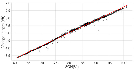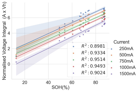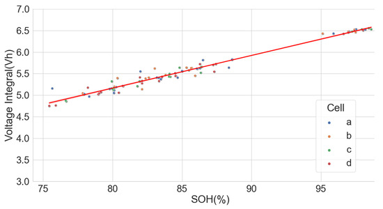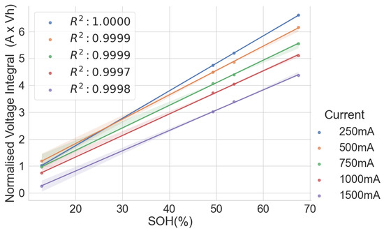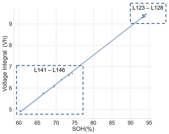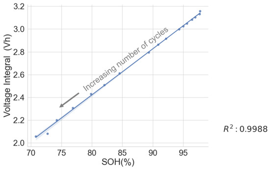 In another ageing test data for 14 cells with LCO-NMC in the positive electrode and nominal capacity of 2800 mAh, the cells were charged at 0.5 C in CCCV and discharged using 1.5 C at an ambient temperature of 25 C [36,37]. Plotting the SOH and the voltage integral also gave similar linear behaviour, with a correlation of 0.9919. See Figure 11.