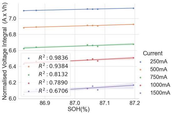 The scattered plots in Figure 2, Figure 3, Figure 4 and Figure 5 show the relationships between the SOH and the normalised voltage integral for four groups of cells, A71–A76, H91–H94, L141–L146 and L171–L176, respectively; each group with a shared history. For the cells H91–H94 and L141–L146 (Figure 3 and Figure 4), the plots fit a linear regression line with a good correlation of , when the charge current is below 750 mA. Also, the ranges of their SOH measurements are 54.74% and 13.9%, respectively. Even though they were obtained from the same old laptop battery pack, their broad degradation spectrum relates to the fact that the cells are rather aged, with an SOH below 75%. For groups A71–A76 and L171–L176 (Figure 2 and Figure 5), they have a higher SOH above 85%, and the range of their SOHs are 2.34% and 0.366%, respectively. The A71–A76 and L171–L176 groups have a lower correlation of and , respectively, when the charge current is below 750 mA.