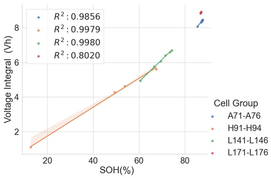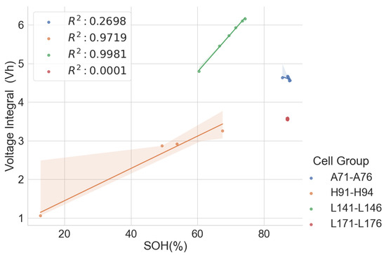 While the cells in each group had the same operational use and may have been subjected to similar stress and degradation modes, Figure 8 provides a promising insight. The two different groups are well aligned along the regression line. This shows that the history and application may have little effect on the voltage integral versus SOH relationship if the cells are of the same model and have similar production materials, processes and specifications.
