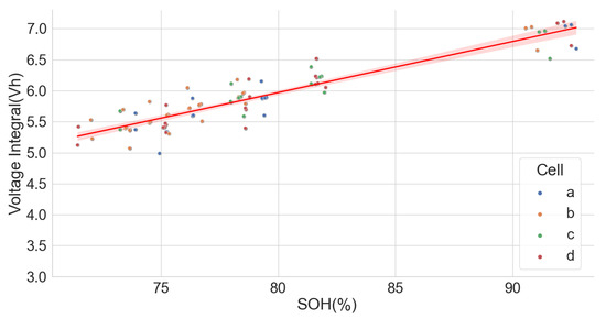 Following the results above, a dataset of the ageing test of some cells with known chemistry type was analysed to find the relationship between their SOH and the voltage integral. These cells include a positive electrode of LCO, as well as a blend of LCO and NMC, LFP, NCA and NMC. The dataset (CS2-37) consists of the measurements from the Arbin tester that was used to perform a cycle test with the charge at 0.5 C using the CCCV and discharge at 1 C on a 1.35 Ah LCO pouch cell at an approximately constant temperature of 25 C [34,35]. The time series dataset was analysed such that each full discharge was used to calculate the SOH of the cell, and the constant current charge phase was used to obtain the voltage integral. The scattered plot of the SOH and the voltage integral in Figure 10 show a good correlation of 0.9977.