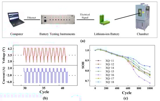 An experimental platform for battery cycle life testing was established, as shown in Figure 2a. The detector used was the Neware BTS-5V12A, with a voltage and current accuracy of 0.05%. Seven Prospower ICR18650P batteries from the same batch, named XQ-11, XQ-12, XQ-14, XQ-15, XQ-16, XQ-17, and XQ-18, with nominal capacities and voltages of 2 Ah and 3.6 V, respectively, were selected. The detailed specifications are provided in Table 1. The experiments were conducted in a temperature-controlled chamber (Sanwood, SMG-150-CC) at a constant temperature of 25 °C, with a deviation of ≤±1 °C. All seven batteries underwent the same set of repeated charge–discharge cycles, including 5 battery preconditioning cycles, 50 battery aging cycles, and 20 battery capacity calibration cycles. As shown in Figure 2b and Table 2, during each battery aging cycle, the batteries were charged at a constant current rate of 1 C until the voltage reached 4.2 V. Subsequently, a constant voltage of 4.2 V was applied until the current decreased to 0.1 C. Following this, the batteries were discharged at a constant current rate of 3 C until the voltage dropped to the cutoff voltage of 2.5 V, after which they were left to rest for 1 h. The state of health (SOH) curves for the seven studied batteries are illustrated in Figure 2c. In this experiment, the SOH is defined as the actual capacity of the lithium-ion battery divided by its initial capacity, as shown in Equation (1):