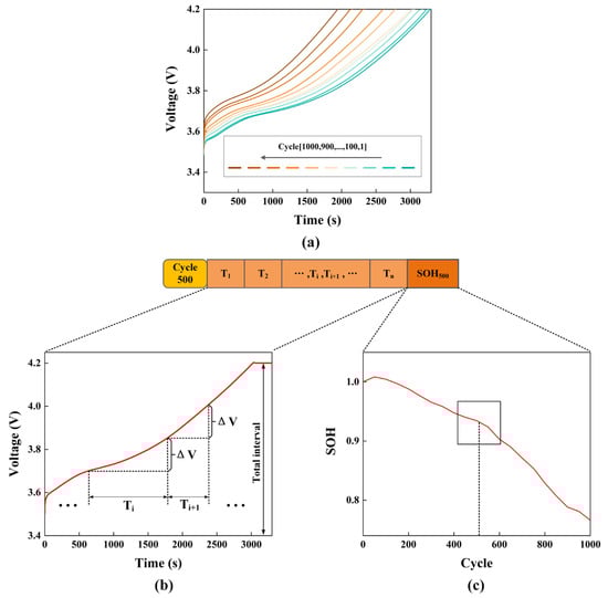 (a) Voltage curves during the aging cycles; (b) specific feature extraction process during the 500th cycle; and (c) specific label extraction process during the 500th cycle.