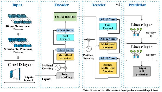 Overall, the role of the encoder in the model is to map sequence data that have undergone feature extraction into a more advanced representation, thereby improving its ability to capture sequence patterns and dependencies in battery data. By combining positional encoding, attention modules, and LSTM modules, the encoder not only enhances the model’s understanding of sequence data but also enhances its capability to predict battery health status.