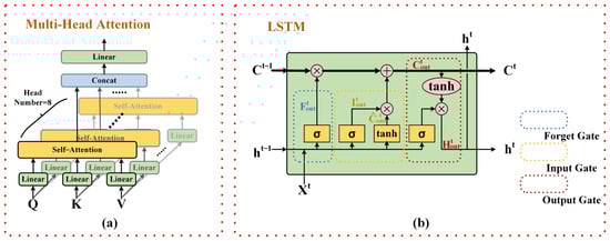 (a) Schematic diagram of the structure of the multihead attention module and (b) schematic diagram of the structure of the LSTM module.