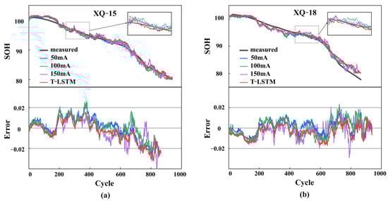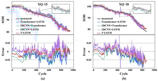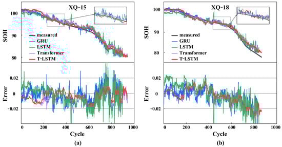 SOH prediction performance comparison of different models: (a) SOH prediction results and errors for Cell XQ-15 and (b) SOH prediction results and errors for Cell XQ-18.