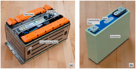 Jellyroll details can help identify relations between LIB construction and performance. Prior to disassembly, cells were discharged (to less than 1 V) by connecting them to an electric resistive water heater element immersed in tap water. Since voltage gradually recovers after discharging, several discharge cycles were needed. Most cells swell when released from within the compression band; the cell over the pressure gas was released by perforating the thin Al alloy top vent. Because water readily reacts with jellyrolls (e.g., corrosion, HF acid, etc.), wet cutting is not advised. To remove jellyrolls, cell enclosures were dry cut just below their tops. Jellyrolls were then pried and pulled out, keeping the multifaceted top attached and intact. Nitrile gloves, goggles, organic vapor masks, shop coats, and adequate ventilation were used. Figure 2 shows a disassembled cell; the cell enclosure base had no visible seams. Each cell contains four flattened rectangular jellyrolls, connected in parallel, saturated with electrolyte, and sealed within the cell enclosure. The Figure 2 caption provides more details. Once exposed to ambient air, jellyrolls react and electrolyte evaporates. To better preserve them, a FoodSaver® Vacuum Sealing System V3420 (Sunbeam Products, Inc., Boca Raton, FL, USA) which uses polyethylene and nylon bags [23] was found to be simple and effective. Vacuum-sealed jellyrolls, cells, and modules were stored in an electrically grounded flammable storage cabinet on nonconductive polymer shelf liners to await further operations.