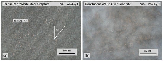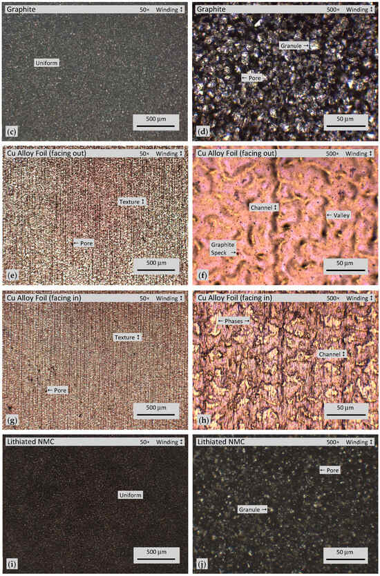 Microscopic homogeneities, anisotropies, and defects are present in jellyroll components. Substantial microscopic texturing occurs parallel to the winding direction for Cu alloy and Al alloy foils as well as the separator. Texturing aligned parallel to the winding direction is also observed macroscopically, as shown in Figure 2d; this is more readily seen when electrolyte-wet, but it is not easy to identify at 50× and 500× magnifications.