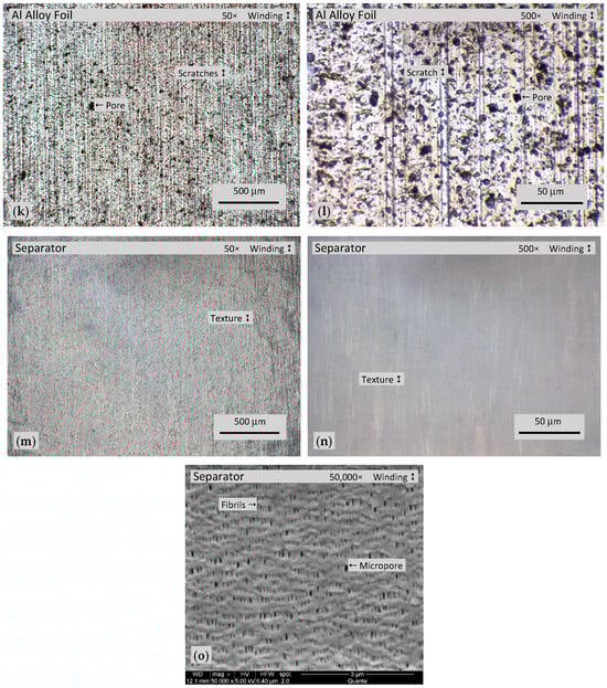 Optical microscopes are generally limited to ~1000–1500×, so substantially higher magnification was needed to observe finer details of separator morphology. An FEI Quanta 650 (FEI Company, Hillsboro, OR, USA) scanning electron microscope (SEM) was used. The imaging sample was prepared by adhering a small portion of separator to an Al alloy SEM mount using carbon conductive tape, followed by gold sputter coating for improved electrical conductivity. A 50,000× SEM image is shown in Figure 4o. Its morphology has likeness to Celgard® [24], which comprises microporous polypropylene (PP), where microporous polyethylene (PE) is added for trilayer (PP/PE/PP) versions.