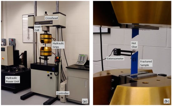 An Instron (Norwood, MA, USA) model 8802 servo hydraulic test system was used for all mechanical tests, as shown in Figure 5. This ±250 kN capacity system features a 2527-113 dynamic load cell, 2742-501 fatigue rated hydraulic wedge grips, FastTrack 8800 digital control and software, two external strain channels, DAX V9.1 data acquisition, and 5 kS/s maximum sampling rate. With this system, the crosshead with attached load cell and upper grip are first positioned and locked, then an actuator moves the lower grip to apply tensile or compressive load. To measure enclosure sample tensile strain, a 2620-824 dynamic strain gage extensometer (extended to 50.8 mm gage) was adhered to unpainted sides of the dogbone-type test samples using hot glue, which is fast, strong, cheap, and easily removed. A right triangle helped with aligning the test samples parallel to the machine loading direction. Preliminary displacement-time tests with no test sample or applied load measured the maximum machine actuator rate as 67.9 mm/s; the minimum was substantially less. Tensile testing ocurred over a wide available range: 5 mm/s, 35 mm/s, and 65 mm/s, with data recorded at 5 kS/s. The Side C sample was tested at the midrange rate.