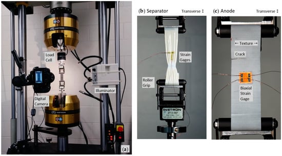 (a) Experimental setup for jellyroll component tensile tests; illuminated cathode being tested. (b) Video snapshot of beginning stages of a separator tensile (transverse) test at 5 mm/s showing orthogonal ultrahigh elongation strain gages. (c) Video snapshot of an anode tensile (transverse) test at 0.05 mm/s just prior to fracture showing biaxial strain gage. The grip rollers are 50.8 mm (2 in) wide.