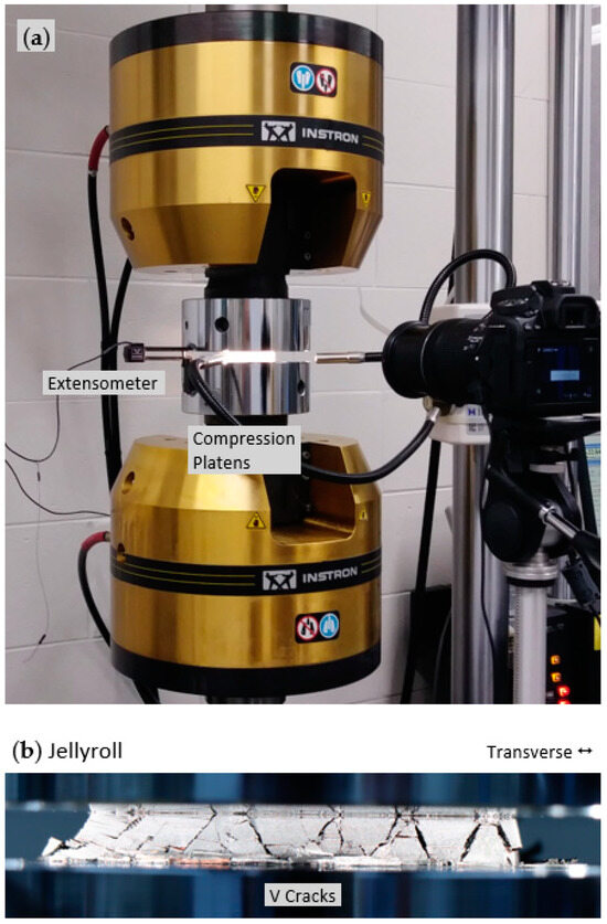 For anode, cathode, and separator stack samples, jellyrolls were unrolled and components were separated, dry cut using the paper trimmer method, and then stacked to approximate heights of a full jellyroll (~10–12 mm thick). Layer orientation as found within original jellyrolls was maintained. Once separated and stacked, these and full jellyrolls were dry cut to ~50 mm × 50 mm squares using a Leco (St. Joseph, MI, USA) MSX255 sectioning machine with medium duty Al2O3 impregnated wheel and gradual manual feed. Samples were sized large enough to observe fracture pattern progression if present, as shown in Figure 7b, without overloading the ±250 kN loadcell; a relatively high-capacity machine is needed. To avoid excessive edge damage during cutting and sanding, samples were compressed within thin sacrificial Al alloy sheets on the soon-to-be ~50 mm × 50 mm test sample faces using trigger clamps and/or C-clamps. After cutting, full jellyroll sample edges were dry sanded within the clamped Al alloy sheets parallel to component layer directions using 240 grit SiC sandpaper; the rotary cutting lines were removed for better close-up visualization. The others were not sanded in this fashion. Again, the samples were kept reasonably electrolyte-wet by storing them in plastic bags with other intact electrolyte-wet jellyrolls.