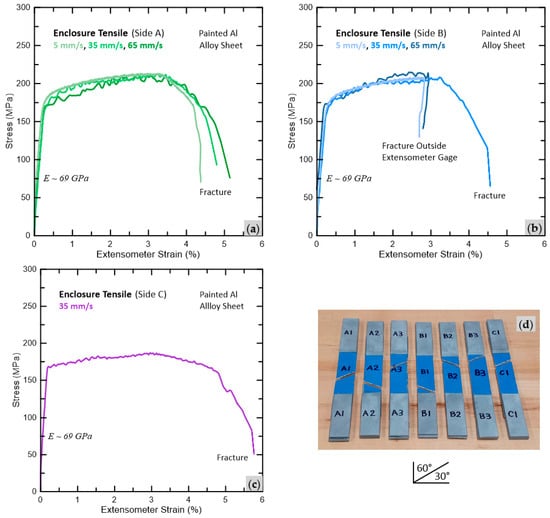 (a–c) Enclosure case material tensile behaviors. (d) Photograph of tested ~240 mm × 25 mm dogbone-type test samples showing 30°/60° oriented fractures.