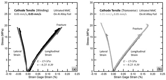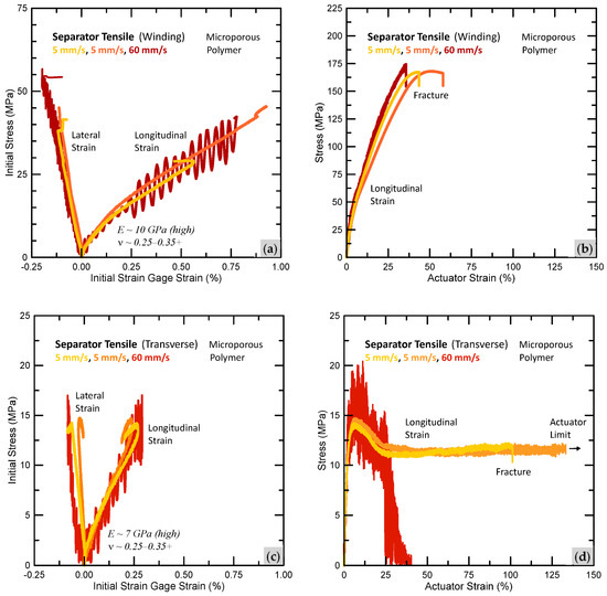 Separator Young’s moduli of 10 GPa (winding) and 7 GPa (transverse) from Figure 11a,c seem high considering that the upper range for engineering polymers is about 10 GPa [31]; for polypropylene, it is about 2 GPa [31]. Other researchers report lower Young’s moduli for separators when using DIC to measure strain. Even with very compliant strain gages as used here, extra deformation resistance afforded by the strain gage and its adhesive (which fills separator pores and stiffens) likely affected the strain measurements. A non-contacting video extensometer (e.g., Instron AVE 2) may be a better strain measurement approach for separators; a speckle pattern is not needed. When determining elastic properties, only the very initial loading behavior makes sense since non-linear behavior and strain reversals quickly follow.