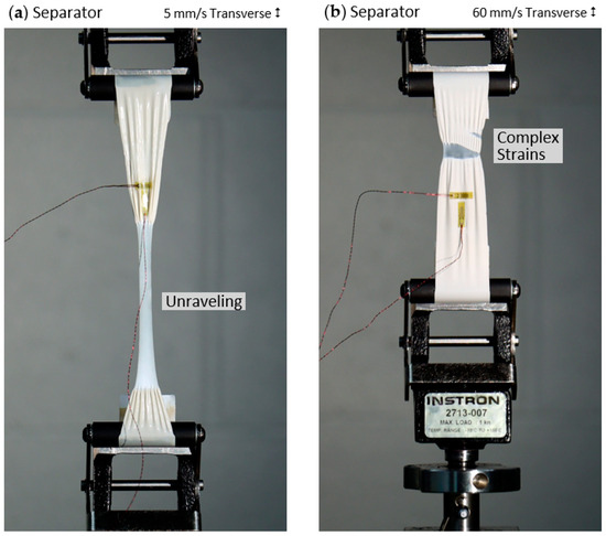 Separators initially load linearly and elastically; their stress-strain plots become non-linear early on, followed by localized strain reversals (e.g., reverse loop), a complex strain field, very large strains, and unraveling (transverse samples only). Samples loaded along the winding direction (less interesting and not shown) did not unravel; their strain field was much less complex. The winding direction is slightly stiffer, much stronger, and with less maximum strain than the transverse direction. Unraveling for transverse-oriented separators appears to substantially reduce strength and increase maximum strain at lower test rates, as shown in Figure 12a,b. For both orientations, maximum strain is reduced at higher rates and the tests are “noisier”, as shown in Figure 11a–d. Loading orientation and strain rate affects separators, as reported by others.