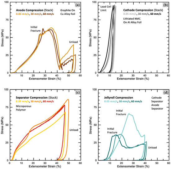 When separated, stacked, and compressed, anodes fracture while cathodes and separators do not. Compressed jellyrolls develop well-defined V-shaped cracks aligned parallel to the winding and texture direction; this was repeatedly observed during each and every test. These cracks compromise the separator and cause anodes and cathodes to touch, likely initiating a short circuit. Anodes and jellyrolls exhibit an additional major load peak. Cathodes are slightly stiffer at higher rates. Separators are slightly stiffer and stronger at higher rates and are also “noisier”. Jellyrolls are stiffer, weaker, and fracture earlier at higher rates. While stacks of anodes do significantly crack when compressed, it is unclear if individual anodes sandwiched between separators initiate V-shaped cracking in jellyrolls. Materials with mechanically dissimilar properties, when laminated and loaded, often exhibit complex behaviors (e.g., composite laminates) which are frequently misunderstood, unpredictable, and sensitive to lay-up.