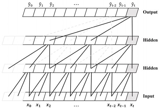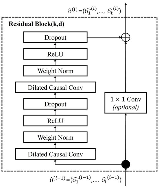 In order to meet the first characteristic, the TCN utilizes a 1D fully convolutional network (FCN), where the output hidden layer matches the length of the input hidden layer. To achieve this consistency, zero padding is applied using the kernel size −1 to retain the same length as the preceding layer. To satisfy the second causal characteristic, the TCN uses a causal convolution operation in which the convolution operation at the time only comprises the time of the previous layer and the time points before it. In other words, TCN = 1D FCN + causal convolutions.