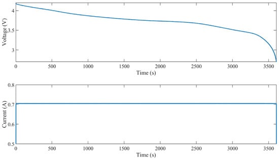 The experiments used battery data provided by the NASA Ames Research Center and Oxford. NASA’s battery dataset includes periodic charge and discharge cycles using lithium-ion 18650 batteries. These experiments yielded information on temperature, load voltage, current, and time. Charging was conducted at a constant current of 1.5 A until the battery voltage reached 4.2 V, while discharging proceeded at a constant current of 740 mA until reaching 2.7 V. Herein, data from Battery #5 were used. Oxford’s dataset includes periodic charge and discharge experiments using small lithium-ion pouch cells in a 40 °C environment, performed at constant current and constant voltage. In this study, data from Battery Cell 1 were used. The vehicle simulator dataset was generated by serially connecting eight lithium-ion 18650 battery cells and conducting discharge experiments using a vehicle simulator. This vehicle simulator was based on the The Hyundai Motor-manufactured Avante Sports AD 16 vehicle produced in Ulsan, South Koreaand was custom-built to match the wheel size and motor RPM specifications for the experiments. The vehicle simulator operated in FTP-75 mode, and the experiments continued until the battery pack was fully discharged. For the NASA dataset, the B0005 battery dataset was used, and a total of 6 and 144 cycles were used for the tests and learning, respectively. The Cell 2 battery dataset from the Oxford dataset was utilized, with a total of 6 cycles for testing and 71 cycles for training. In the case of the vehicle simulator dataset, 1 cycle was used for testing, and 10 cycles were used for training. The experimental data is visualized in Figure 4, Figure 5 and Figure 6.