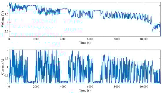 Voltage and current of the cell of the vehicle simulator battery pack used in the experiments.