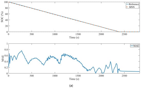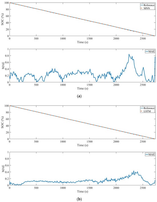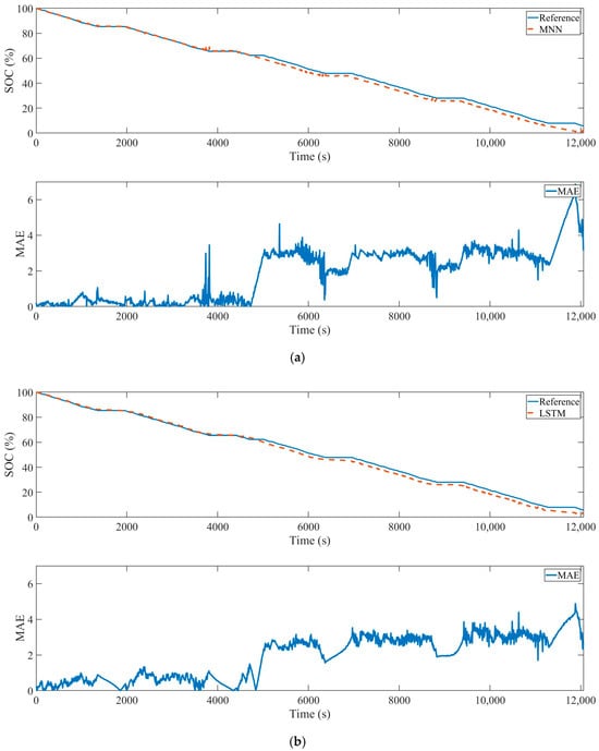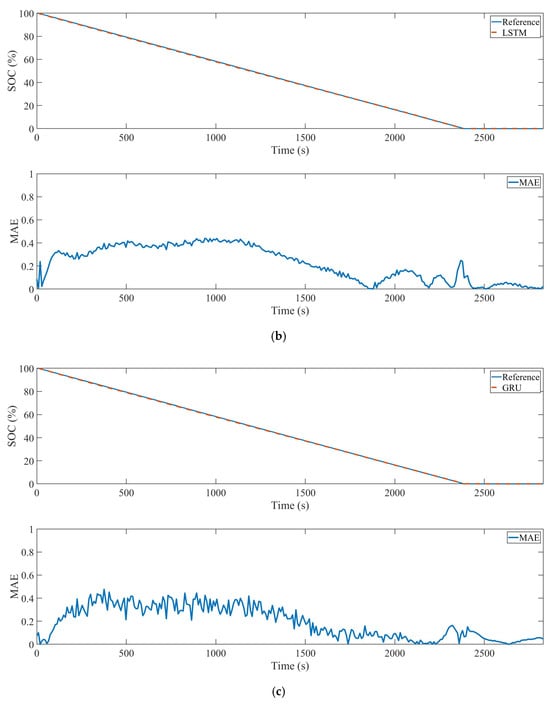 To validate the performance of our proposed model, we compared its results with those of other battery SOC estimation studies [,] that used data from Battery #5 in the NASA dataset. Zhang et al. [] proposed an SOH–SOC simultaneous estimation model based on the GWO-BP neural network. The algorithm in [] exhibited an average SOC estimation error within 5%. The model presented in our paper demonstrates battery SOC estimation with an accuracy of <1%, indicating its ease of use compared to BP-based models []. Furthermore, Li et al. [] estimated battery SOC using the FCNN, 2DCNN, and 3DCNN models based on CNN. Among the proposed models, FCNN achieved the best performance, with a MAE of 0.4694. The model proposed in this paper shows easy battery SOC estimation, with an MAE of 0.095.