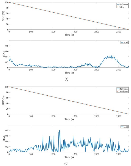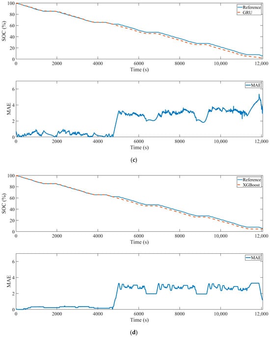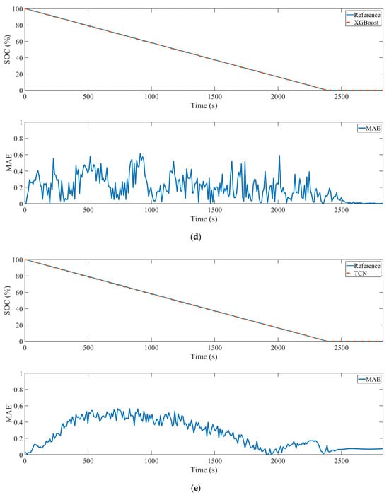 The experimental results obtained for each model using the NASA dataset are presented in Table 3. The mean absolute errors (MAEs) for MNN, LSTM, and GRU are 0.1408, 0.1296, and 0.1313, respectively. XGBoost and TCN exhibit MAEs of 0.1275 and 0.128, respectively, while TCN-XGBoost (one node) and TCN-XGBoost (two nodes) demonstrate MAEs of 0.1005 and 0.0955, respectively. The evaluation revealed that the SOC estimation by the proposed TCN-XGBoost hybrid model outperformed those by other models for 150 cycles, representing the battery test dataset under degraded conditions. Additionally, for the remaining NASA test dataset, the proposed model exhibited greater accuracy compared to the other models.