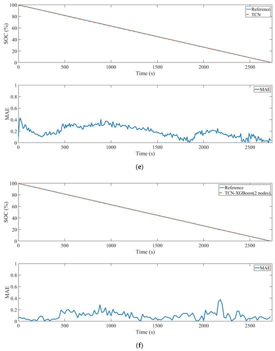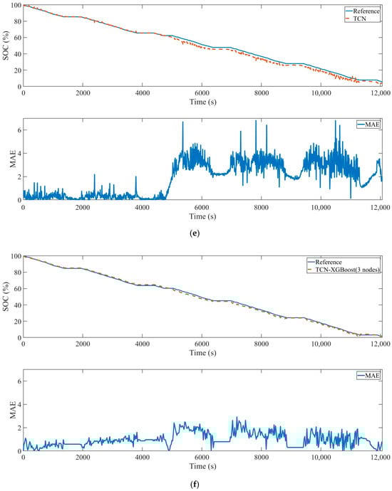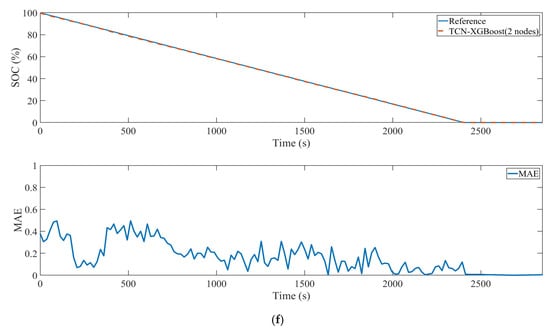 SOC estimation results and mean absolute error of each model for 78 cycles using the Oxfrod dataset. (a) MNN, (b) LSTM, (c) GRU, (d) XGBoost, (e) TCN, and (f) TCN-XGBoost (two nodes).