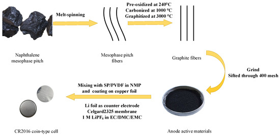 Figure 1 shows the preparation procedure of graphite fibers anode materials and the half-cell used for electrochemical performance testing. The as-synthesized mesophase pitch-based graphite fibers were ground into powder using a grinder and then sifted through 400 mesh to be used as the active materials. The homogeneous slurry was prepared by mixing the active materials, Super-P and polyvinylidene fluoride (PVDF) binder (85:5:10 in a mass ratio) in N-methylpyrrolidone (NMP) solution first, and the formed slurry was coated onto copper foil with a thickness of 10 μm to be used as the working electrodes. The CR2016 coin-type cells were manufactured in a glovebox with working electrodes, a counter electrode (Li foils, 12 mm in diameter), a Celgard2325 polypropylene porous membrane and electrolyte of 1 M LiPF6 in ethylene carbonate/dimethyl carbonate/ethyl methyl carbonate (1:1:1 in a volume ratio).