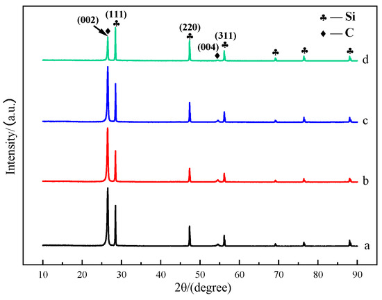 The structure of the synthesized mesophase pitch-based graphite fibers was investigated using an X-ray diffractometer (XRD, Philips χ′ PERT MPD PRO, PANalytical B.V., Almelo, The Netherlands) with Cu-Kα radiation. The voltage and current of the test tube are 40 kV and 30 mA, respectively. The scanning step is 0.033°, and the scanning range is 10–90°. The diffraction peak of the (002) planes of graphite was corrected by adding a certain proportion of monocrystalline silicon powder to the sample in order to calibrate the Angle error of the instrument by the standard diffraction peak of monocrystalline silicon. The d-spacing of the (002) plane was calculated using the Bragg Formula (1). The degree of graphitization was calculated using the Mering-Maire Formula (2) according to the Franklin model. The crystallite sizes along the c direction or the crystal stacking height were calculated using the Scherrer Formula (3).