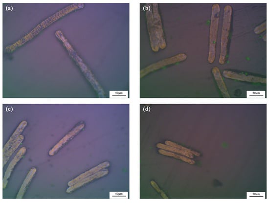 PLM images of cross-sections of the as-synthesized graphite fibers at 200× magnification: (a) GF15; (b) GF30; (c) GF45; (d) GF75.
