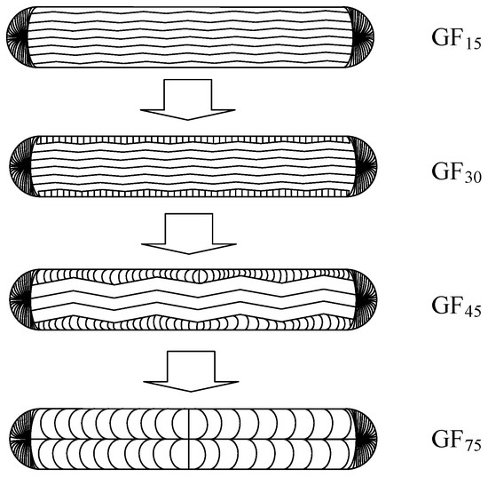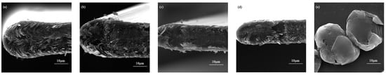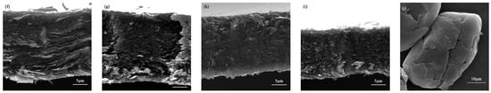 Figure 4 is the SEM images of the as-synthesized mesophase pitch-based graphite fibers at different take-up velocities as well as natural graphite. As shown in Figure 4, it can be seen that the thickness of graphite fibers decreases with the increase in take-up velocity. The cross-section of GF15 is dominated by a wavy layered structure similar to that of graphite sheets. When the take-up velocity increased to 30 m min−1, the cross-sectional texture of the fibers changed significantly. The lamellar structures arranged at a certain angle or approximately perpendicular to the main plane of the fiber appeared near the surface of the fibers. The thickness of layers perpendicular to the main plane of the fibers increases with the increase in the take-up velocity, as shown in Figure 5. However, the carbon layer arrangements of the fibers become somewhat disorderly when the take-up velocity increases to 75 m min−1. The parallel layers parallel to the main side gradually curl into a structure perpendicular to the main side. This change in the orientation of the carbon layer will lead to a decrease in the intensity of the (002) plane in the XRD pattern, which is consistent with the results of XRD analysis. Therefore, it is necessary to choose the appropriate take-up velocity; too low or too high is not conducive to the formation of the required micro morphology. Figure 4e,j shows the morphological structure of natural graphite used for comparison experiments. It can be observed that there are a large number of scaly faults on the surface of spherical particles.