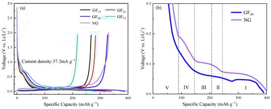 Figure 6a shows the first discharge/charge cycle profiles of as-synthesized mesophase pitch-based graphite fibers at a current density of 37.2 mA h g−1 (0.1 C). Similar to the charge and discharge behavior of the graphite anode material, the voltage drops rapidly to about 0.75 V during the first discharge process as the intercalation of Li+ increases. A voltage platform appears at about 0.7 V, which is a typical feature of the formation process of a solid electrolyte interface (SEI) film. Whereafter, a long and gentle voltage platform appears in the voltage range of 0.25–0.005 V, which corresponds to the intercalation of Li+ in the carbon layers. Figure 6b is part of the voltage-specific capacity profile during the first lithium intercalation process, from which one may find five stages for the lithiation of natural graphite electrodes in the voltage range of 0.3–0 V. According to previous work [32,33,34], these stages correspond to five continuous transitions of Li-graphite interlayer compounds (Li-GICs): . However, unlike natural graphite, there is no distinct voltage platform generated by the phase transition between Li-GICs with a different order during the first lithiation process of as-synthesized mesophase pitch-based graphite fibers anode materials. This may be due to the formation of co-existing high-order and low-order Li-GICs in the intercalation of Li+. Combined with the initial charge/discharge-specific capacity and coulomb efficiency of as-synthesized mesophase pitch-based graphite fibers at the different take-up velocities listed in Table 3, it can be seen that GF45 has the highest initial reversible specific capacity and coulomb efficiency, which are 326.5 mA h g−1 and 84% respectively and are close to that of natural graphite. Part of the irreversible capacity during the first charge/discharge cycle contributes to the formation of a SEI film on the surface of the electrode. It can be seen that the discharge-specific capacity during the first cycle of the as-synthesized fibers is lower than that of natural graphite. The prepared graphite fibers cannot achieve a structure of the ideal graphite and the pore-structure and defects may exist inside the graphite fibers. More lithium ions may need to be consumed to form SEI films. On the other hand, the existence of defective structures increases the compatibility of graphite fibers and electrolytes to a certain extent, which may be one of the reasons for the good capacity retention rate of graphite fibers after 100 cycles.