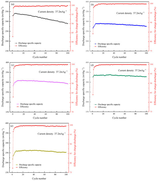 The galvanostatic electrochemical measurements and rate capacity measurements were operated on a Neware battery tester with a potential range of 0.005~2.000 V (vs. Li+/Li) and a current density of 0.1 C (37.2 mA g−1), 0.5 C, 1 C, 2 C and 5 C. In this paper, the intercalation of Li+ between carbon layers is represented by the discharge curve and the de-intercalation process of Li+ between carbon layers is represented by the charge curve. The cyclic voltammetry data was obtained at a scanning rate of 0.1 mV s−1 and a potential window from 0.005~2.000 V (vs. Li+/Li) on an electrochemical workstation (CHI660D, Chenhua, Shanghai, China). The EIS measurements were performed on an electrochemical workstation (CHI660D, Chenhua, Shanghai, China) over a frequency range of 100 kHz to 0.01 Hz. The batteries were subjected to five charge/discharge cycles under a constant current prior to EIS testing.