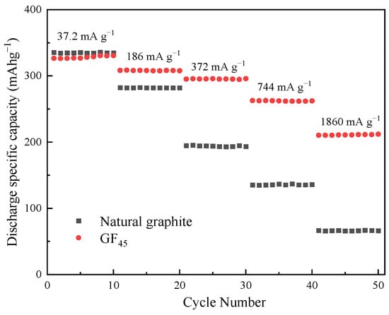 Rate performance of the as-synthesized graphite fiber GF45 and natural graphite.