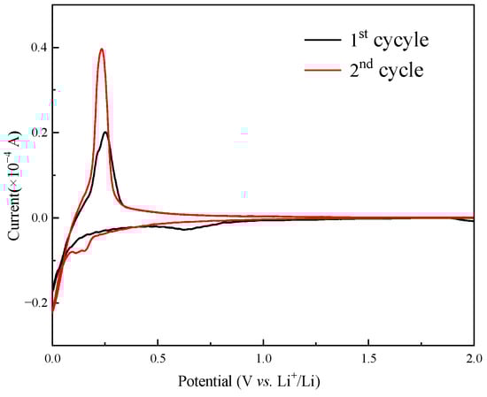 Cyclic voltammetry tests on GF45 were carried out in order to learn more about the electrochemical characteristics of the as-synthesized mesophase pitch-based graphite fibers, and the results are displayed in Figure 9. During the initial reduction process, the peaks in about 0.7 V are consistent with the formation process of SEI film on the electrode surface due to the reduction and decomposition of the solvent molecules in the electrolytes. During the second cycle, the reduction peak basically disappeared, indicating that the SEI film had formed during the initial cycle. Several small reduction peaks below 0.2 V during the second cycle correspond to lithiation reactions of Li+ inserting into the carbon layers to form Li-GICs. In the initial thermo-oxidative stabilization process, a distinct oxidation peak appears at approximately 0.25 V, which corresponds to a highly concentrated delithiation process of as-synthesized graphite fiber. The narrow oxidation peak with high current intensity is in accordance with the long and slow voltage platform in Figure 4, which is advantageous for the output of a stable voltage and in enhancing the battery’s working voltage. There is little variation in the potential difference between the oxidation peak and the reduction peak, implying that the polarization impact is minor when as-synthesized graphite fibers are used as the anode electrode material, and there is a relatively high degree of reversibility in the reaction of lithiation and delithiation.