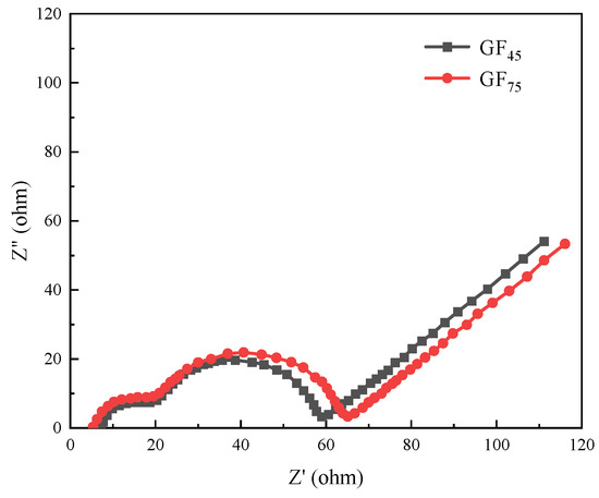 The electrochemical impedance spectra (EIS) of GF45 and GF75 were obtained in order to learn more about the effect of take-up velocity on the electrochemical characteristics of the as-synthesized mesophase pitch-based graphite fibers, and the results are displayed in Figure 10. Since the battery has already undergone five charge/discharge cycles before the EIS test, it can be assumed that a stable SEI film has been formed. From Figure 10, it can be seen that the electrochemical impedance spectrum of the graphite fiber consists of three parts: a semicircle with two parts overlapping in the high-frequency and mid-frequency regions, and a straight line in the low-frequency region, which represents the impedance of the SEI membrane, charge transfer impedance and impedance of lithium-ion diffusion (Warburg impedance), respectively. Warburg impedance is related to the combined effect of lithium-ion diffusion at the interface of the electrode and the electrolyte. With the increase of take-up velocity, the diameter of the semicircle in the high-frequency region does not change much, and the diameter of the semicircle in the mid-frequency region increases, while the slope of the straight line in the low-frequency region is the same. The results show that the take-up velocity has the most effect on the charge transfer process inside the graphite fiber. The charge transfer impedance of GF45 is lower than GF75 and therefore exhibits better electrochemical performance, which is consistent with the previous tests.