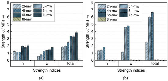 Adhesion strength values for the (a) l-mw and (b) h-mw electrode samples. represents the adhesion strength, the maximum compression strength, and the sum of and .; the x indicates that for the given samples no clean pull-off could be achieved.