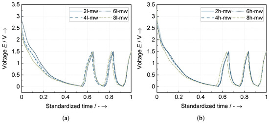 Voltage profiles of selected (a) l-mw and (b) h-mw half-cell samples.