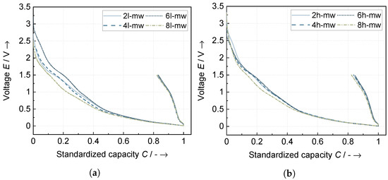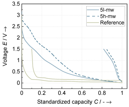 Considering the voltage profile of the representative half-cell samples against the reference half-cell (see Figure 6) reveals a noticeably different discharge behavior. These deviations become particularly apparent during the first discharges. While the depicted reference half-cell is fully discharged at a standardized time stamp of 0.18, the 5l-mw and 5h-mw half-cell samples require time values of 0.53 and 0.58, respectively. This indicates more extensive SEI generation, which is ascribed to the significantly larger total surface area of the nanoscale graphite particles compared to the macrometer-sized reference graphite particles. Examining the BET surface area of the two materials unveils that the nanosized type (BET: 195 ) exhibits a BET approx. 72 times larger than the conventional counterpart (BET: 2.7 ). The deviance in the peak structure suggests that, unlike for the reference half-cell, the SEI is not yet fully formed for the l-mw and h-mw half-cell samples. Furthermore, the shape of the cycling curves differs significantly. This is indicative of a distinctly different characteristic active material behavior, which is further examined along with the capacity profiles.