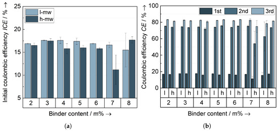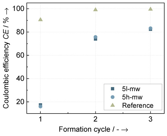 The comparative analysis with the reference half-cell (see Figure 10) elucidates a large discrepancy in the values. The reference half-cell exhibits an initial of roughly 90% and approximates 100% within the second and third cycle. The l-mw and h-mw half-cell samples, however, show an initial lower than 20%. Although the improves over the subsequent cycles, the values do not reach the ones of the reference half-cell. This reiterates that further cycles are required to attain a stable state after SEI formation and thus to approach the maximum . Furthermore, the CE provides information about the total irreversible capacity loss. While the reference half-cells lose only 10% of the initial capacity, it drops by more than 80% for the l-mw and h-mw half-cell samples. This is attributed to the different active material content, the strongly varying BET surface, and the differing material behavior [62].