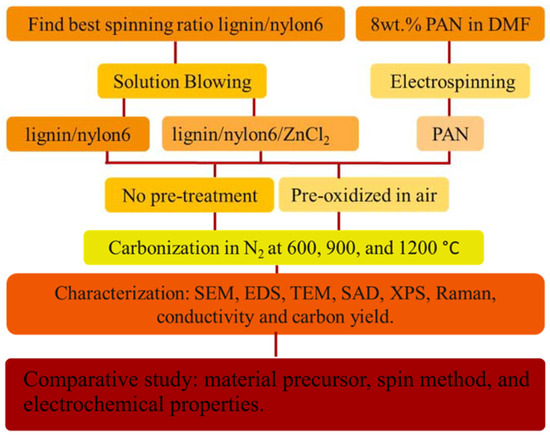 The nanofiber specimens were identified according to the processes used during their formation. For example, specimen L2_NO_H1 means that an original specimen with 80 wt.% of lignin and 20 wt.% of nylon 6 (L2 specimen of Table 1), without a pre-oxidation step, was carbonized according to the heating profile H1 (Table 2). Another example: P1_PO_H2, means that this specimen originated from a PAN nanofiber mat that was pre-oxidized and then carbonized according to the H2 profile. The flow chart of the methodology used in the present work is depicted in Figure 1 to facilitate general comprehension. The characterization procedures are further described in the Supplementary Materials.