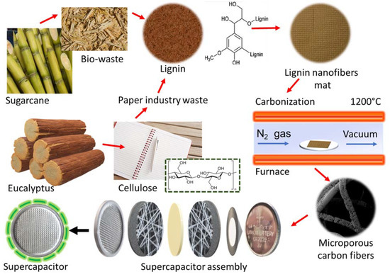 Although PCNFs are efficient and have attracted significant attention in the literature, non-petroleum-derived green materials are called for in this field to reduce the environmental impact. As an alternative, lignin holds great promise as an eco-friendly, raw material substitute of PAN for electrode manufacturing. Biodegradable lignin is the second most abundant biopolymer. It is widely available, and more importantly, lignin is also available as the bio-waste of several industrial processes. There are different types of lignin, which vary by plant source and extraction process [8]. Many tons of kraft lignin result from the paper industry as a by-product, and yet it is mostly utilized as a cheap fuel source. To increase sustainability and add value to lignin waste, as well as to diminish the use of petroleum-derived polymers, lignin-derived carbon nanofibers (LCNFs) have recently been formed and tested in supercapacitors [9,10,11,12,13].